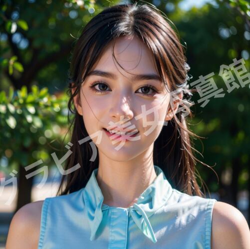 淡いブルーのトップスに映える清楚な美しさと、柔らかな表情が、見る者の心を優しく包み込みます。